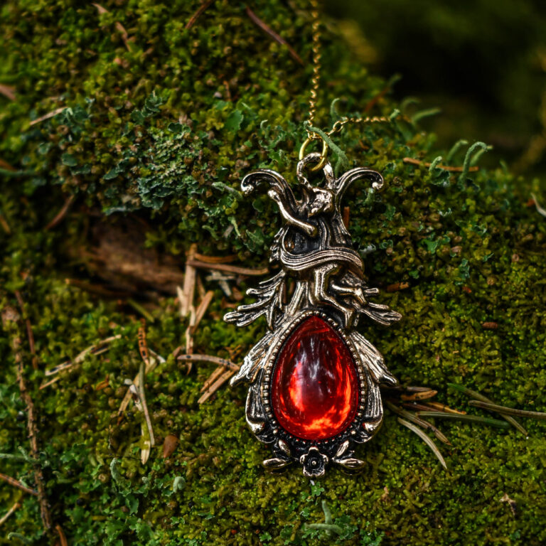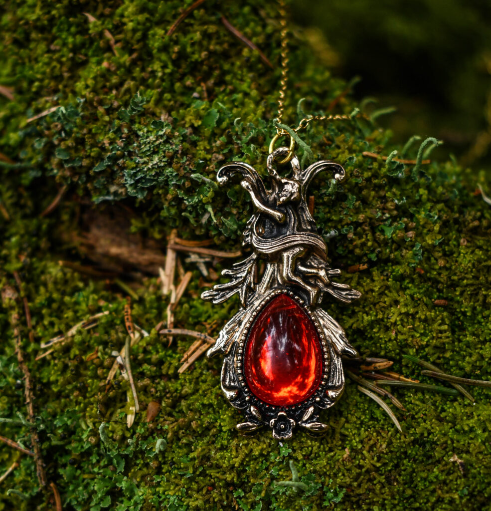 See ainulaadne kaelakee on kui tükike minevikku, mis toob endaga kaasa salapära ja kirgliku jõu. Sügavpunane klaaskivi särab valguses kui hõõguv süda, mida ümbritseb kaunilt vormitud vintage-stiilis metallraam. Kujundus viib mõtted romantilisse ajastusse, kus igal detailil oli oma tähendus ja igal ehteks kantud sümbolil oma lugu.